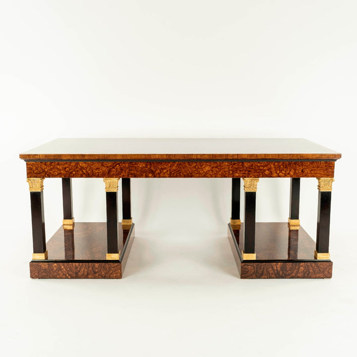 20th Century lacquered burl wood desk with three drawers supported with black columns and gilded capitals.