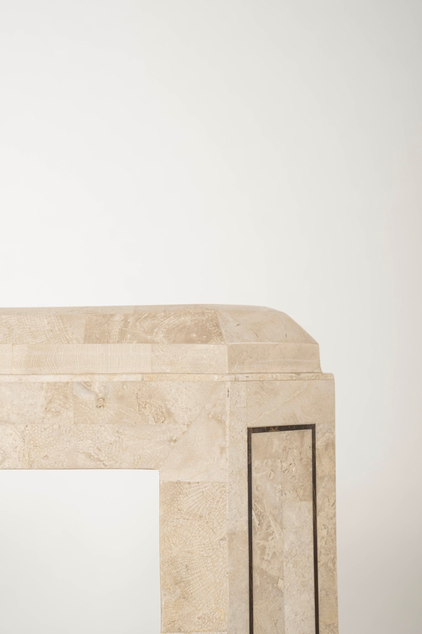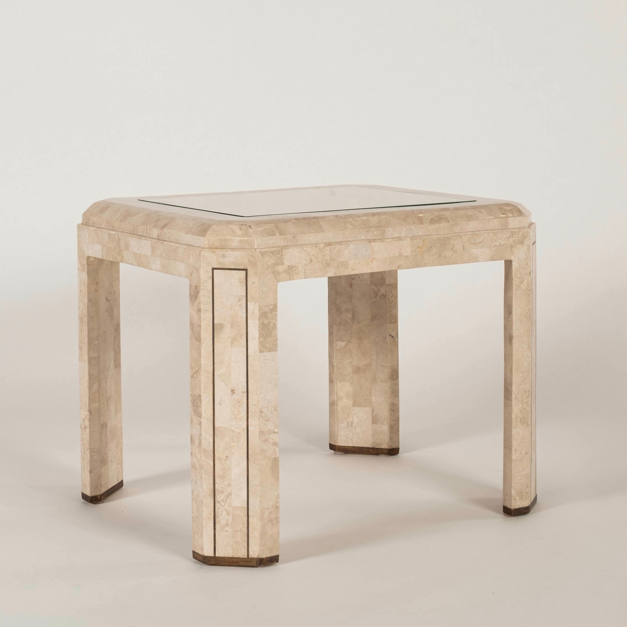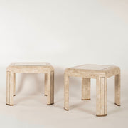 Pair Maitland Smith Tessellated Travertine Brass End Tables