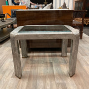 Pair Maitland Smith Tessellated Gray Marble & Glass Side Tables