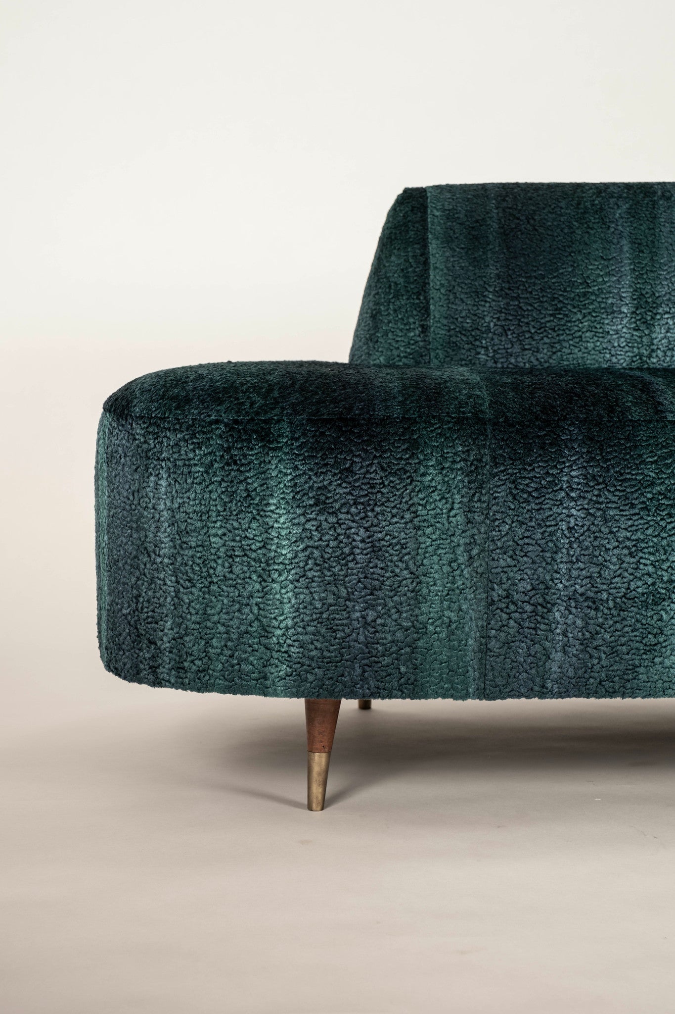 Wood, brass, newly rebuilt upholstery: ombre peacock cut mohair velvet.