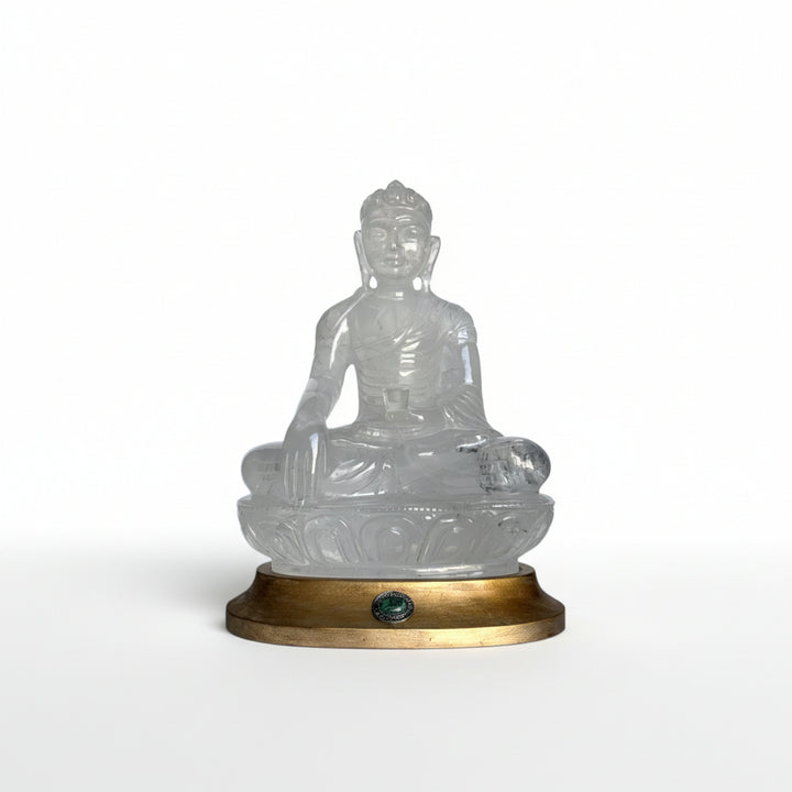 Seated figure of Guanyin carved from translucent rock quartz. The bodhisattva is depicted in a meditative posture with simplified drapery and restrained modeling. The sculpture is mounted on a wood base fitted with a single turquoise cabochon, described as Tibetan.