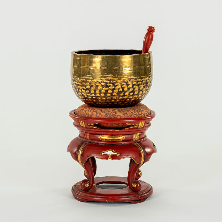 20th century Tibetan singing bowl with red painted wood pedestal and tufted cushion.