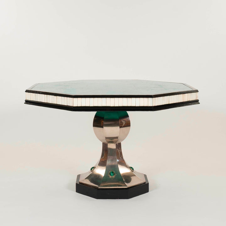 Malachite stones on base, faux malachite top, bone, nickel plated metal, lacquer.