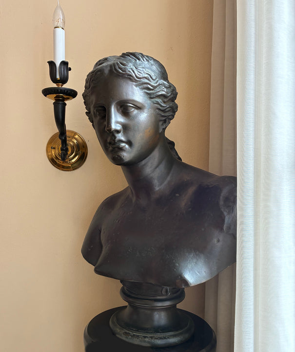 Life size, bronze bust reduction after the ancient Roman sculpture known as the Capitoline Venus, cast by the Paris foundry F. Barbedienne Foundry. The figure depicts the goddess with softly inclined head, centrally parted hair drawn into a low knot, and idealized classical features. The bust truncates across the upper chest and shoulders and is mounted on a circular socle. “F. BARBEDIENNE. FONDEUR. No. 6/12, série de 600,” referencing a production batch within Barbedienne’s authorized edition series. 27"H x 22"W x 15"D.