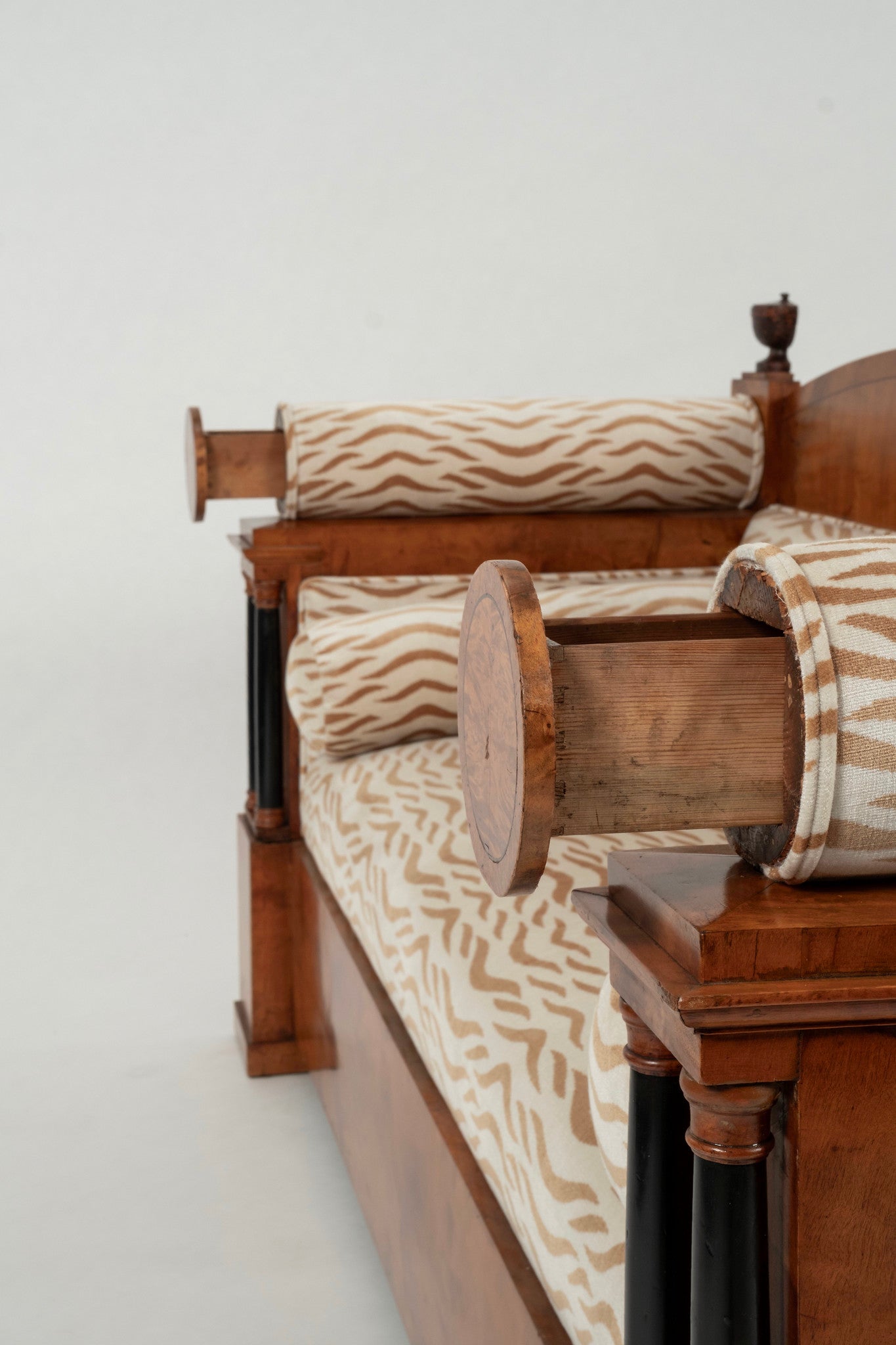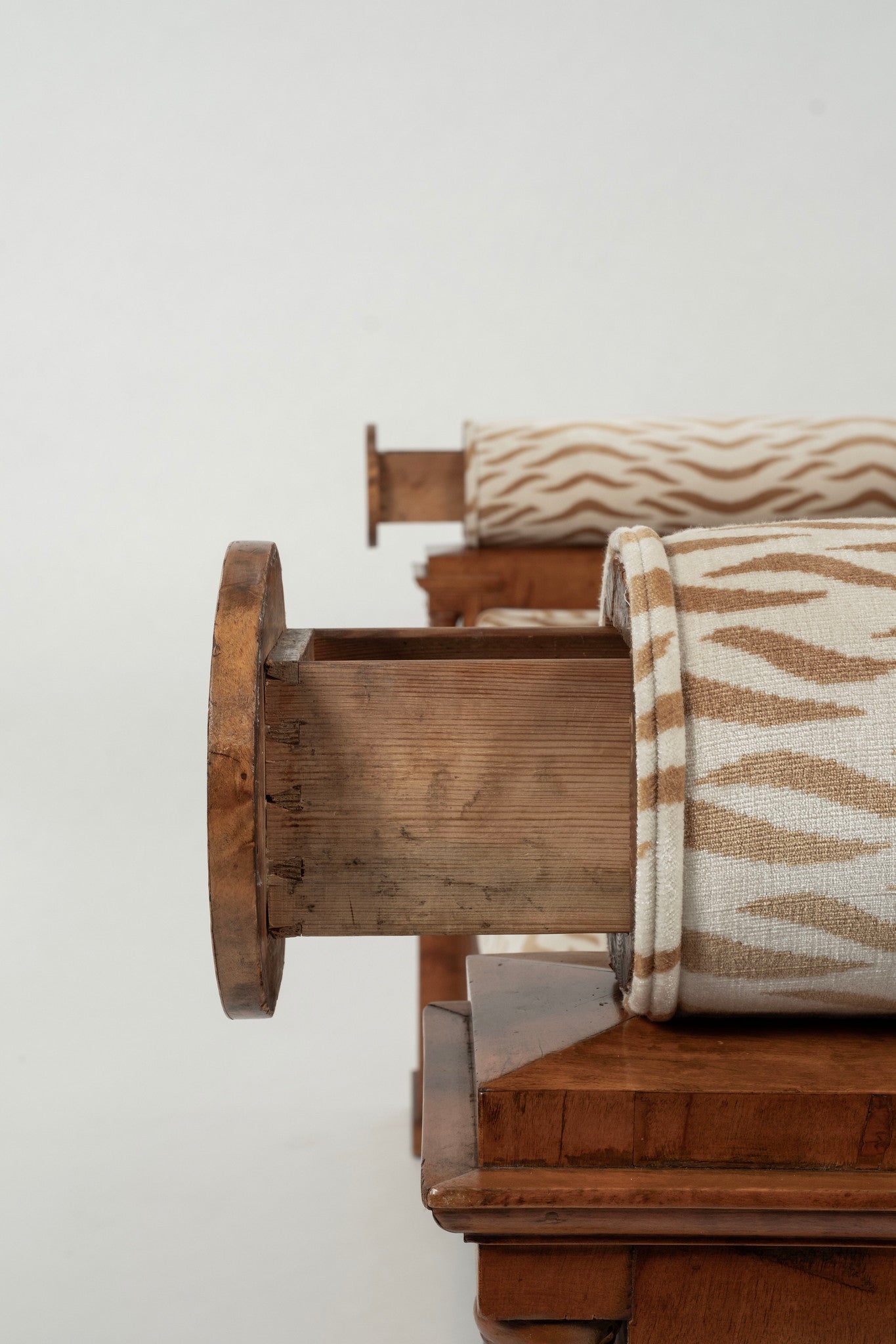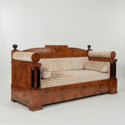 1820s Wood, birch burl veneers, two hidden drawers, new upholstery.