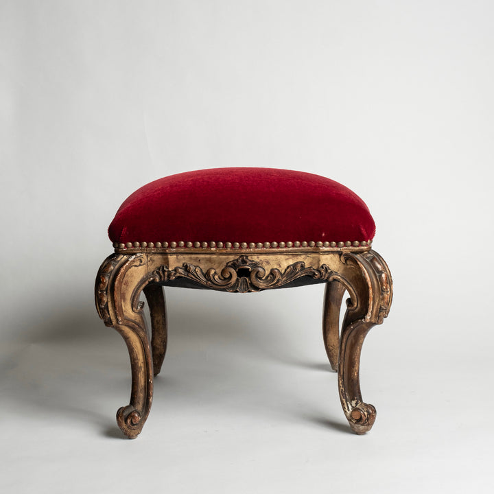Pair 19th Century Louis XV Style Gold Giltwood Rouge Red Mohair Tabourets