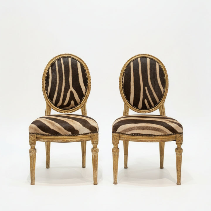 Pair 19th Century Louis XVI Style Giltwood Zebra Hide Side Chairs