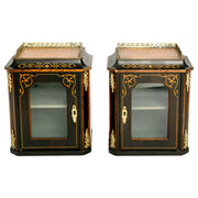 Handsome pair of 19th century Italian wall vitrines. Each petite cabinet features beautiful marquetry, bronze ormolu, glass door and single shelf.