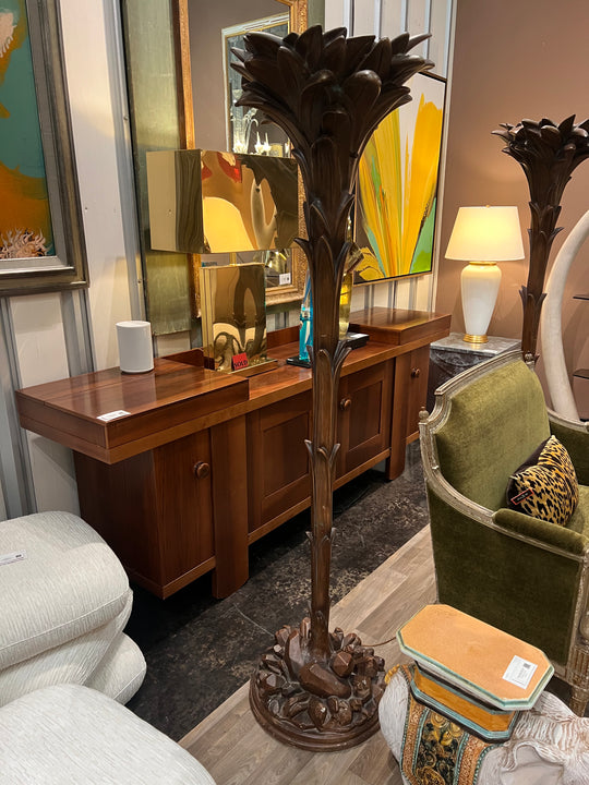 Molded and painted resin with gold aged gilding – these elegant Hollywood Regency style palm uplight torchieres are in the manner of Serge Roche.