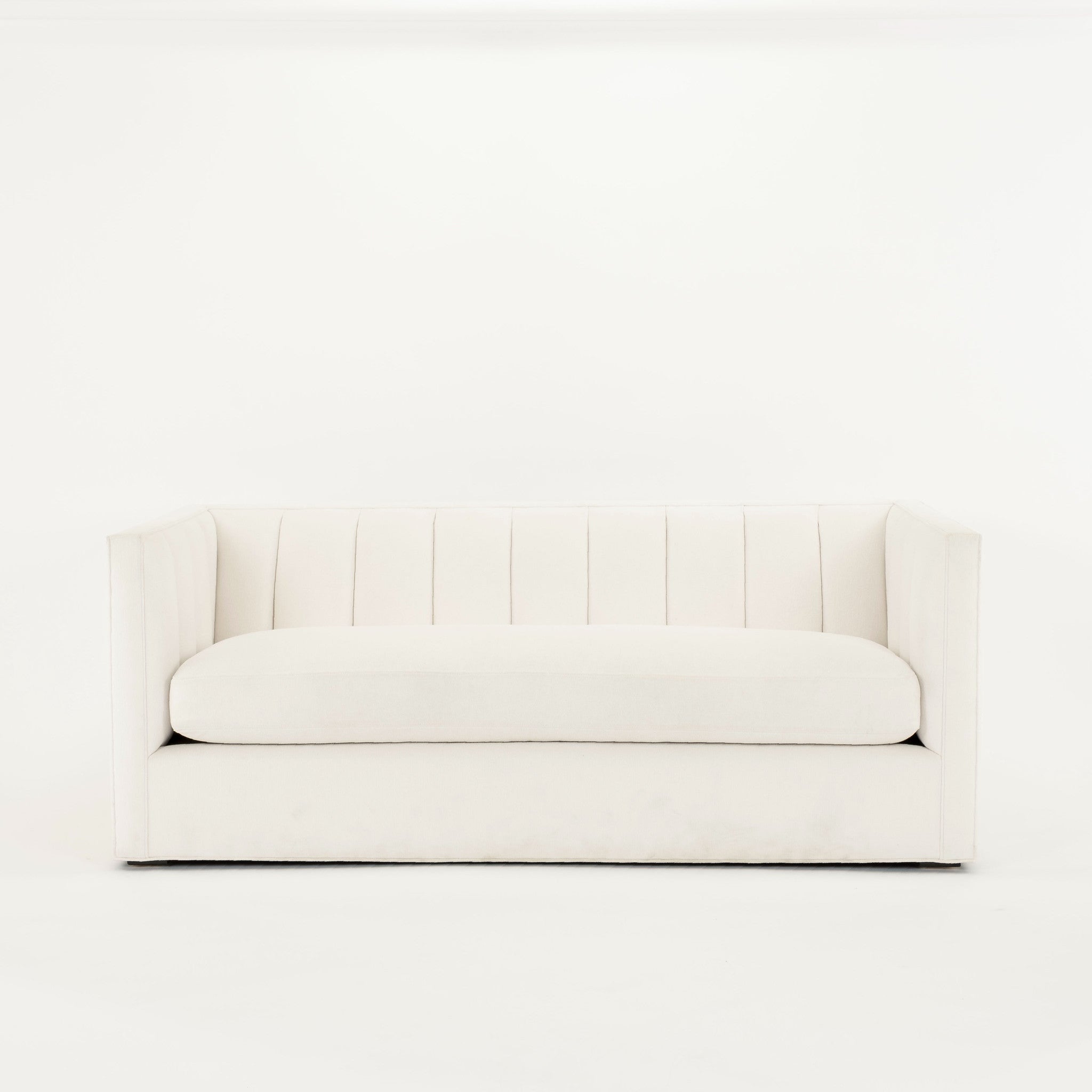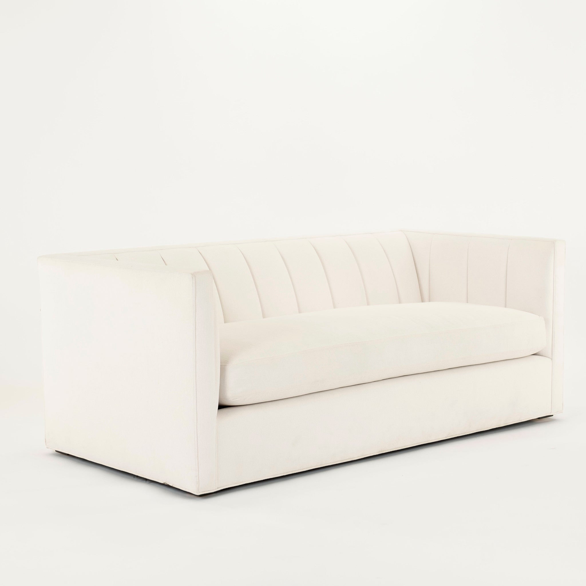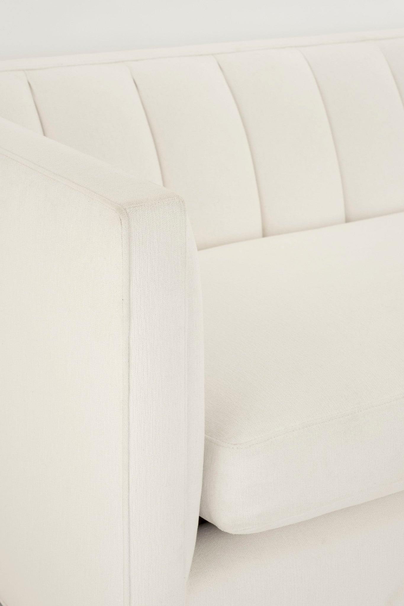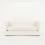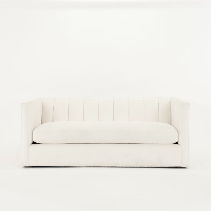 Contemporary tuxedo style sofa with channelled back upholstered in a white Perennials fabric.